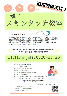 令和元年11月17日(日)に岐阜市徹名公民館にて、第9回親子スキンタッチ教室を追加開催します。「スキンタッチって?」